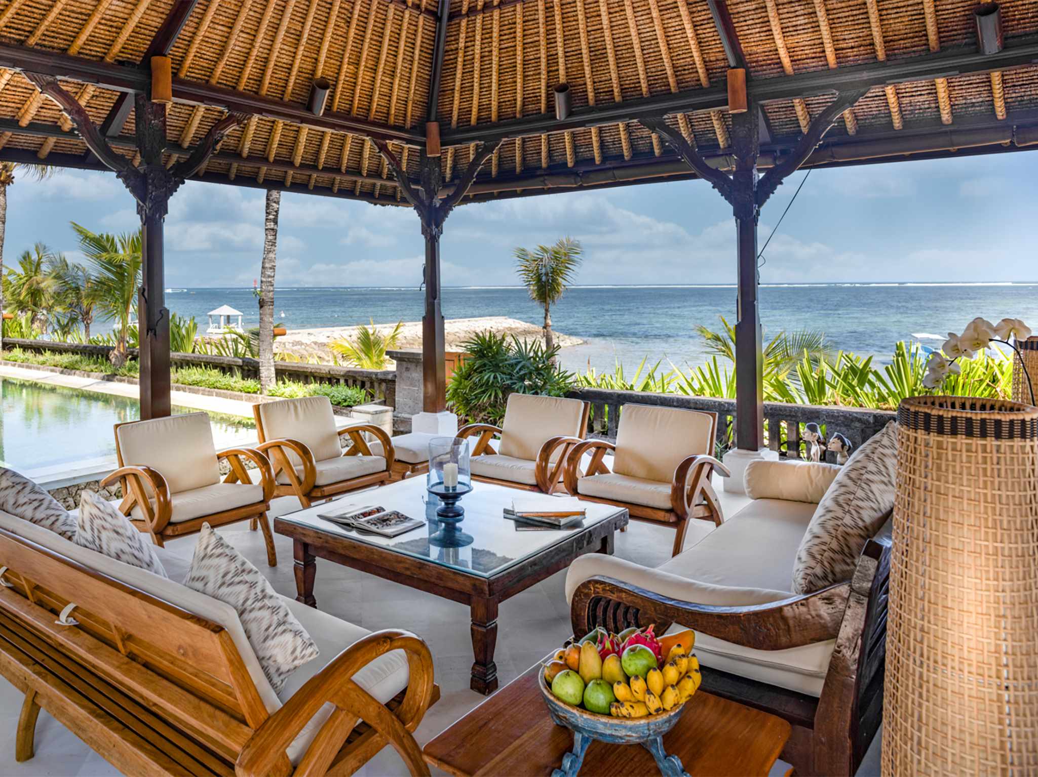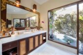 Acclaimed Balinese architect Popo Danes fused the best traditional materials and craftsmanship with contemporary furnishings and facilities to create a gracious, elegant and comfortable home for the villa’s Australian owners, promising days full of magic. Linger over a leisurely lunch prepared by the villa’s cook from an extensive suggestion menu and served in the open-sided living pavilion. Take a siesta on the pool deck, indulge in a massage at the beachfront balé or sink into the black terrazzo jacuzzi in the master pavilion’s private bathroom courtyard. After a candle-lit dinner or fresh-from-the-sea barbecue, retire to your air-conditioned bedroom for a night of sweet, sun-induced slumber.