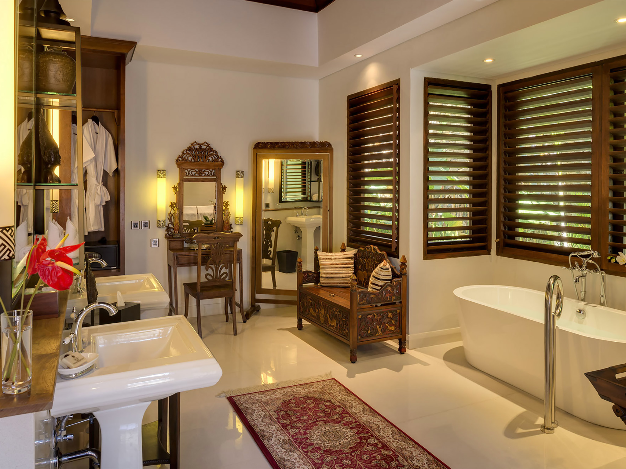 Within the vaulted, teak wood-lined pavilions is a wealth of colonial-style furniture, prized antiques, and Asian ceramics and artefacts. Blending in easily with this heritage influence, find contemporary luxuries such as dreamy four-poster beds, indulgent bathtubs, flat-screen televisions and Bose speakers. Not to mention the luxury of having a professional team of staff catering to your every whim including an accomplished chef who will be delighted to serve mouthwatering fare to your entire group. For more options, you could always stroll down the main Seminyak street and discover popular Bali restaurants and beach bars such as La Lucciola and Potato Head.