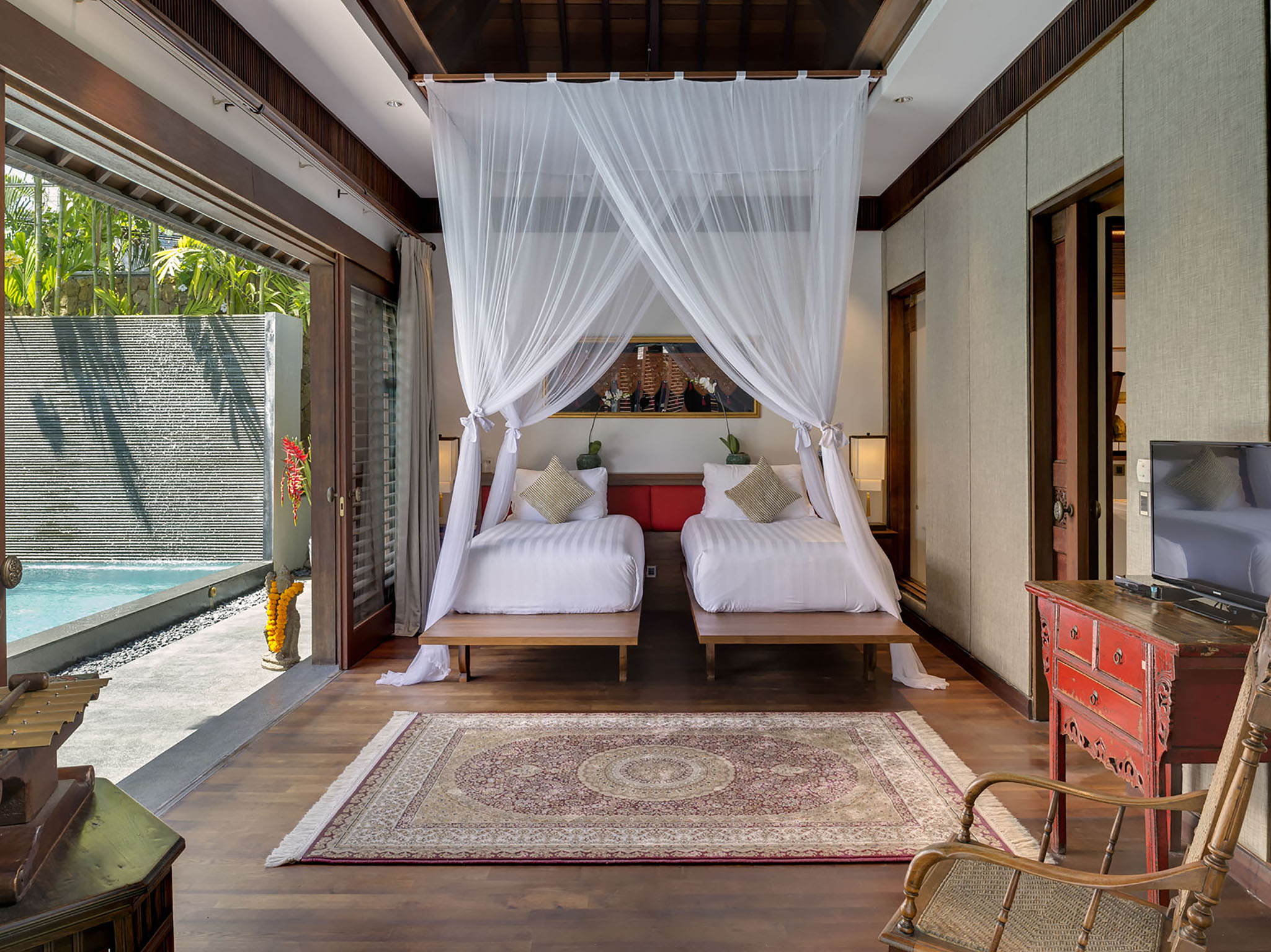 For larger groups (up to 18 adults and four extra children), the villa can be rented in conjunction with the four-bedroom Des Indes I next door, to create a nine-bedroom estate with three pools. It’s a great option for extended families and reunions.