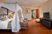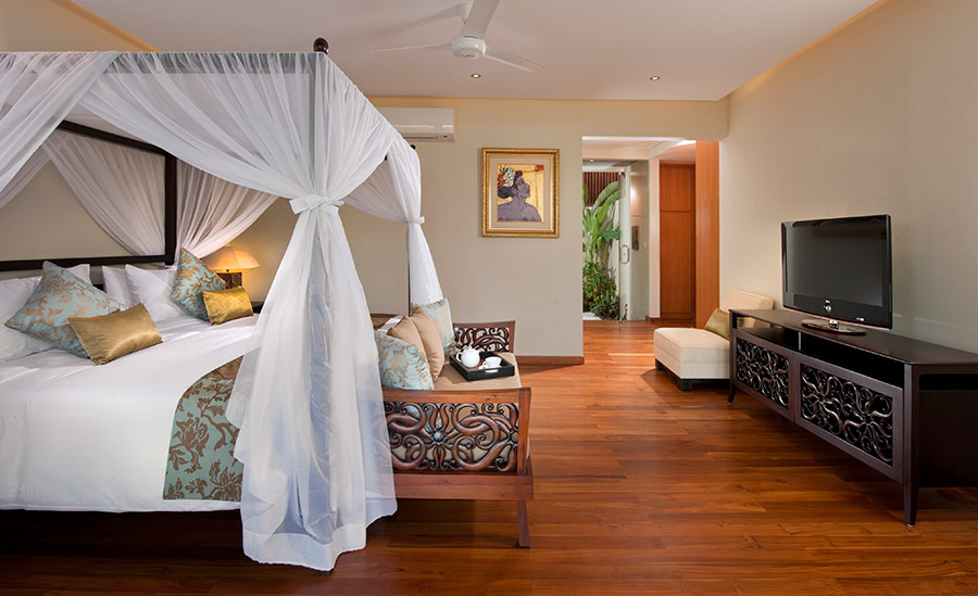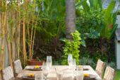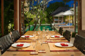 The walled garden and graceful interiors offer an abundance of space, natural light and separate places to relax. Children can enjoy a BOSE surround sound movie on the 48″ flat screen TV in the entertainment pavilion while one group of adults enjoy some reading in the living room, and another group of adults lounge, surf the internet or watch sports on the 45″ flat screen TV in the garden ‘bale’. The pool deck is punctuated with big pots of flowering lotus. The interiors of the villa have been lovingly furnished, accented with colour and completed with delightful attention to detail.