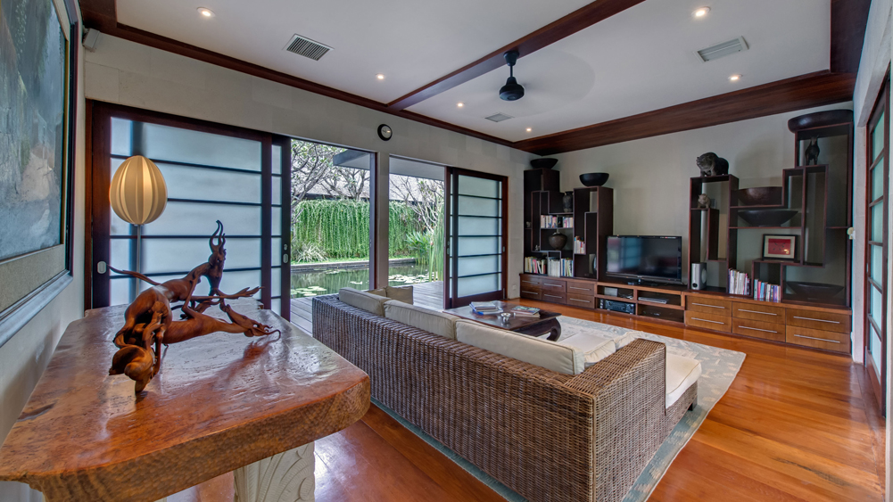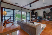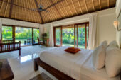 The expansive property offers stunning ocean views across neighbouring rice fields with tantalising glimpses of sacred Mount Agung in the distance. Resting on an impressive 7,400 square metres, guests are privileged to an enormous amount of space. Vast rolling lawns encircle the villa with lavish gardens and water features adding to the sense of grandeur. A stunning 25-metre infinity pool with adjoining entertainment pavilion offers ocean views, as does the massive master bedroom. Large open-air living spaces with high vaulted ceilings enable guests to freely enjoy the balmy Balinese climate, while Thai silk furnishings and a collection of Asian antiques decorate each room in a unique way.